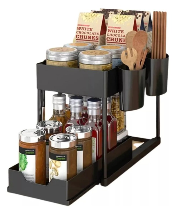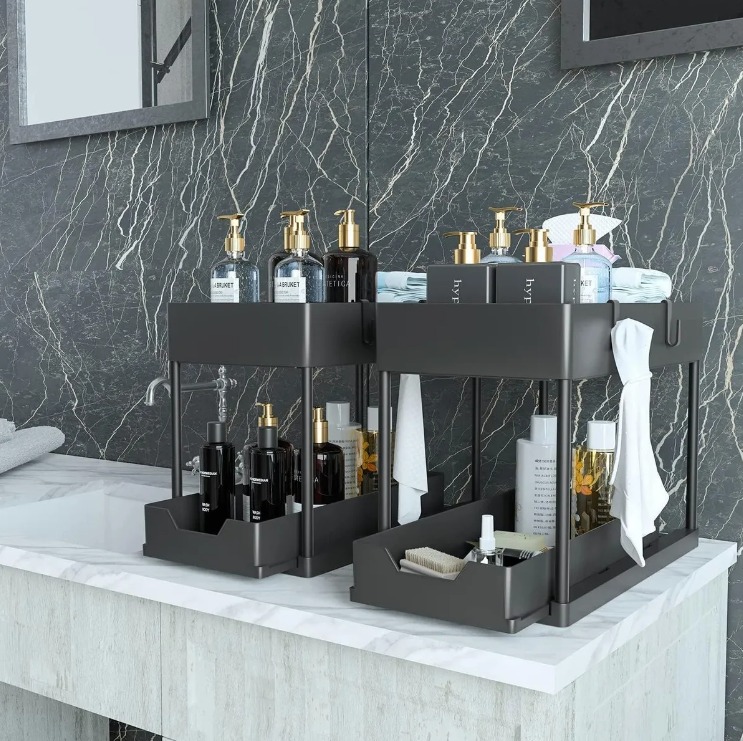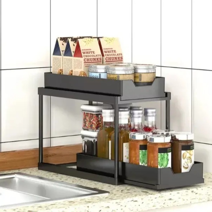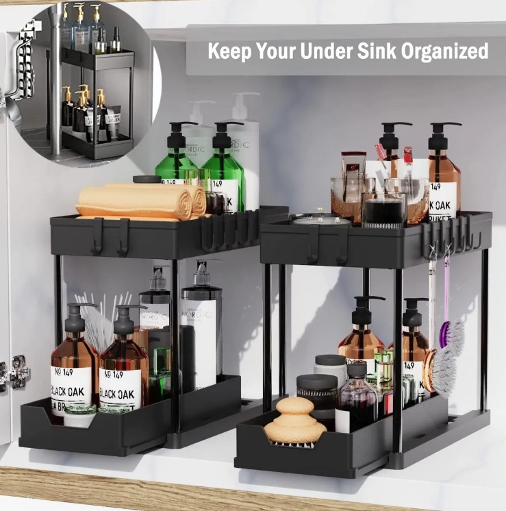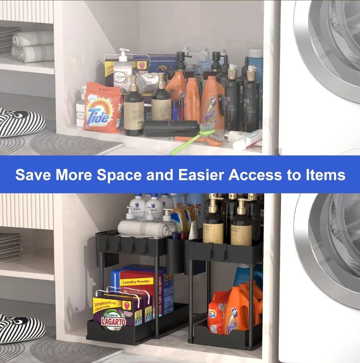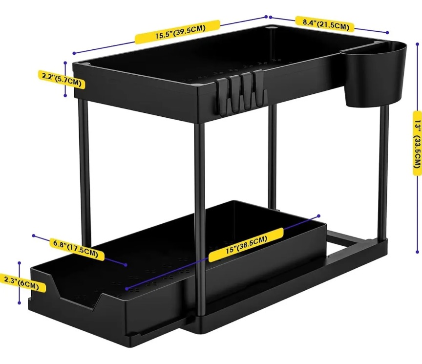 Diseño de doble capa: nuestros organizadores de 2 niveles debajo del fregadero vienen con dos tazas y cuatro ganchos para almacenar algunas piezas pequeñas y ahorrar espacio mejor. Además, el diseño de doble capa le ayuda a almacenar más artículos en el mismo espacio. Multifunciones: Nuestro organizador extraíble debajo del gabinete del fregadero puede almacenar Gel de ducha, champú, ingredientes, condimentos, productos para el cuidado de la piel, cosméticos, jabón, detergente para la ropa, y juguetes para niños. Fácil de limpiar: nuestros organizadores de gabinete apilables de 2 niveles adoptan un diseño hueco, que no acumulará agua y se puede limpiar directamente al limpiar. Puede usarlo con confianza. Amplias aplicaciones: nuestros cajones organizadores deslizantes de 2 niveles se pueden usar ampliamente para agregar espacio de almacenamiento adicional en el fregadero, el baño, la cocina, la despensa, la Oficina y otros lugares. Duradero y duradero: compre nuestro organizador y almacenamiento debajo del fregadero, y puede servirle durante muchos años, ya que está hecho de materiales ABS de alta calidad. Además, es duradero y resistente. Características: 1. El diseño de doble capa le ayuda a almacenar más artículos en el mismo espacio. También viene con una taza y cuatro ganchos para almacenar algunas piezas pequeñas para ahorrar espacio. 2. Encaja perfectamente en cualquier espacio. Se puede utilizar para almacenar Gel de ducha y champú en el baño, ingredientes y condimentos en la cocina, productos para el cuidado de la piel y cosméticos en el tocador, jabón, detergente para la ropa en la lavandería, E incluso los juguetes de los niños en las salas de estar. 3. Adopta un diseño hueco, que no acumulará agua y se puede limpiar directamente al limpiar. El diseño del cajón puede ayudarte a limpiar mejor las esquinas muertas y limpiar en todas las direcciones. Especificaciones: Material: ABS, PP, tubos de acero al carbono Color: negro, blanco Dimensiones: aproximadamente 34x40x17 cm / 13x16x7 pulgadas Peso: Aproximadamente 980g.