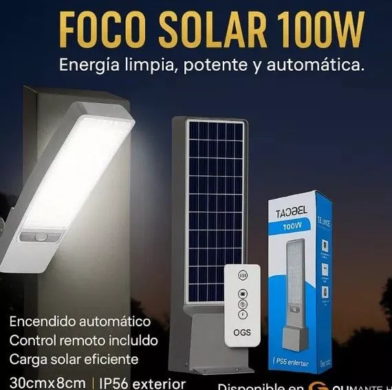 Foco Solar LED 100W con Control Remoto – Energía Automática para el Exterior 🌞 Dale luz a tus espacios sin gastar un peso en electricidad. Este foco solar de 100W combina tecnología LED de alta potencia , carga solar eficiente y control remoto incluido para que tengas iluminación automática donde más la necesites. Energía solar limpia y gratuita Encendido automático al anochecer Control remoto multifunción (modos, intensidad, temporizador) Panel solar integrado de carga rápida Protección IP65/IP56 , ideal para patios, jardines, entradas o zonas de trabajo Dimensiones: 30 cm x 8 cm | Incluye todos los accesorios para instalación. Este foco es perfecto para quienes buscan autonomía energética , seguridad nocturna y ahorro real . ¡Ilumina tu espacio sin cables ni cuentas!